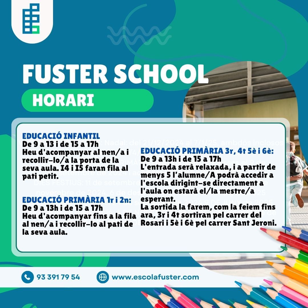Informació Curs 2025-26 Benvinguts i benvingudes a un nou curs! A l’escola Fuster estem a punt per començar el curs 25-26! Aquí teniu informació general molt útil per l’inici del curs
